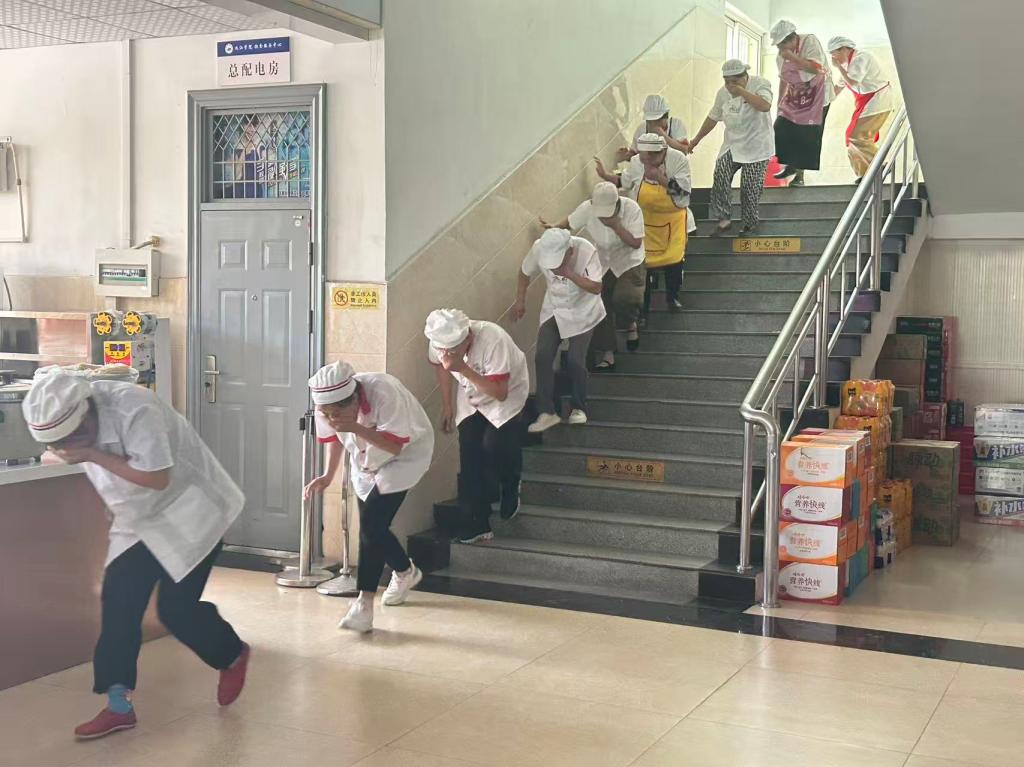 随后进行的应急疏散演练,模拟了食堂后厨发生火情的场景。随着警报声响起,全体员工在安全员的引导下,迅速反应,弯腰低姿、用湿毛巾捂住口鼻,严格按照预定疏散路线,紧张有序地撤离至指定安全区域。整个过程组织严密、行动迅速,达到了演练的预期效果。
