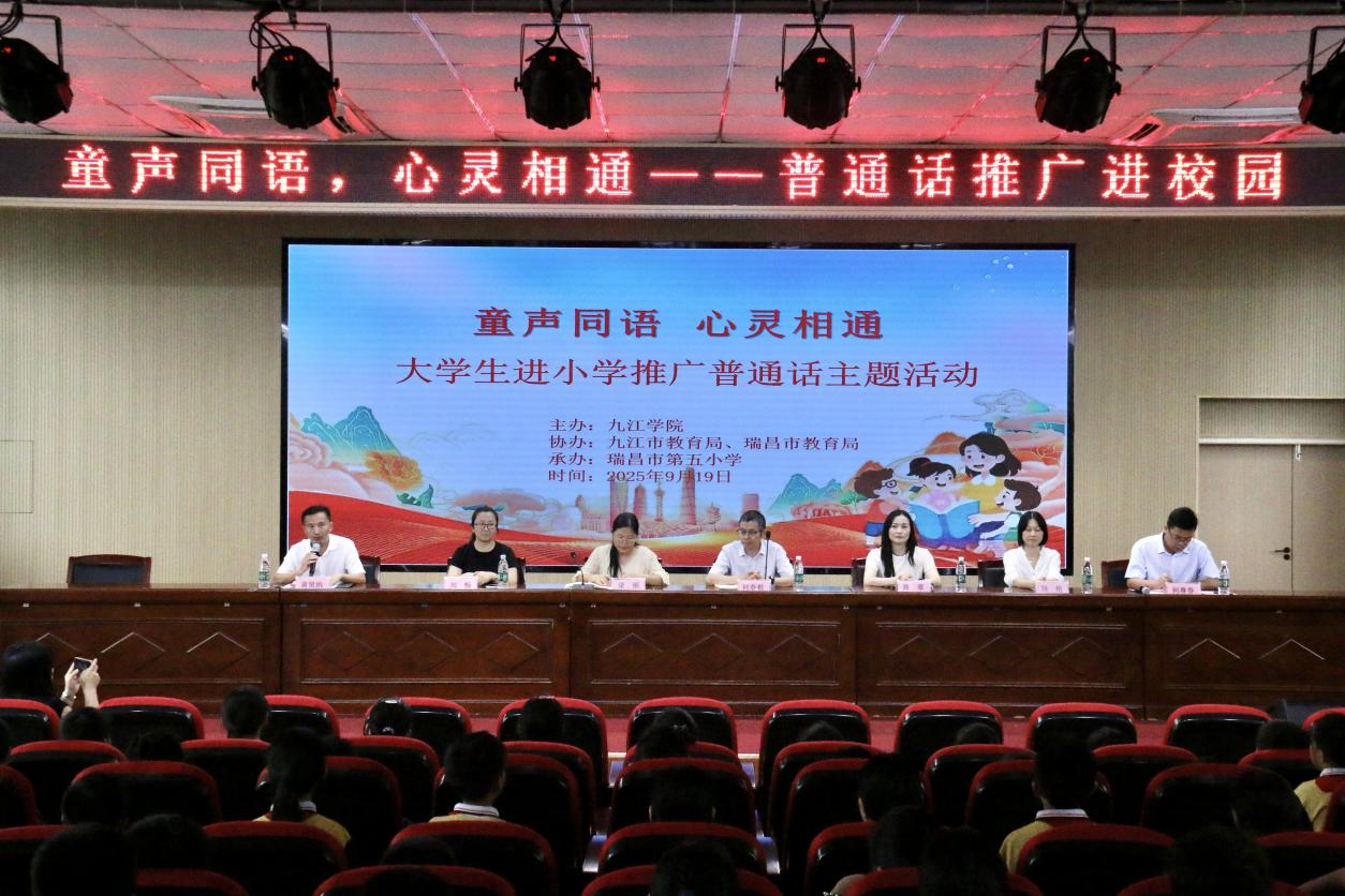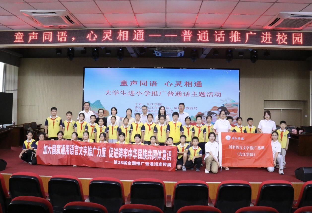 在第28届全国推广普通话宣传周期间,国家语言文字推广基地(beat365官方网站)积极开展线上线下多元推普活动。9月19日,推普课堂走进了瑞昌市第五小学,与九江市教育局、瑞昌市教育局联合举办“童声同语,心灵相通”大学生进小学推广普通话主题活动,为同学们带来了一场互动式的语言文化体验。
