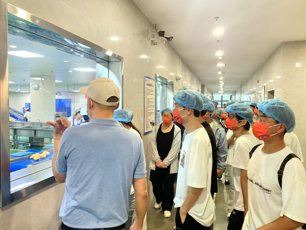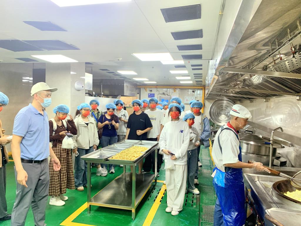 在中心厨房配送区,管理人员化身专业讲解员,为新生们详细剖析“从源头到餐桌”的全链条流程:食材均由资质完备的合作供应商提供,验收时需通过农残等各种快检、资质核查双重关卡;货架上米面油离地离墙摆放,生鲜与冻品分区冷藏,各类食材标识清晰分类存放。如此规范的管理不禁让新生们频频点头,而中央厨房内,米饭生产线、面点生产线、蔬菜洗切生产线、豆腐制品生产线等现代化设备一应俱全,科技赋能餐饮的场景让同学们大开眼界,印象深刻。