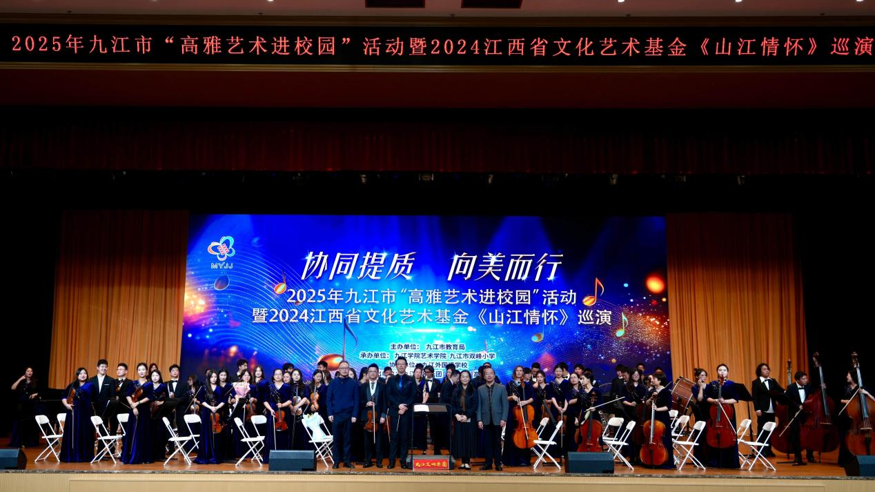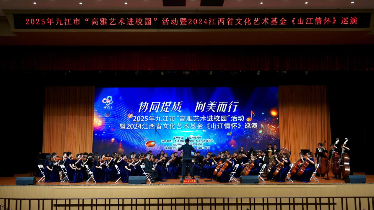 10月23日下午,由九江市教育局主办、艺术学院、九江市双峰小学承办,九江交响乐团出演的九江交响乐团2025年高雅艺术进校园暨江西省文化艺术基金《山江情怀》巡演第四场专场音乐会在九江市外国语学校成功举行。校党委委员、副校长查振华,市教育局党委书记、局长陈琪,市教育局党委委员、副局长曹利平,beat365艺术学院、九江市外国语学校负责人等到现场与全场师生一同观看演出。