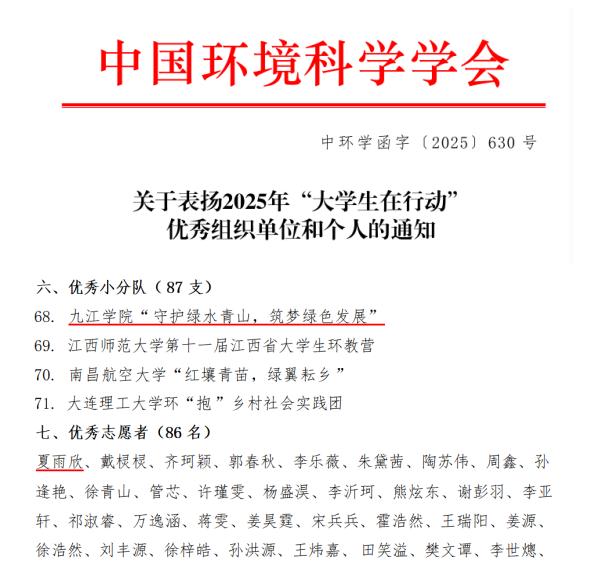 近日,中国环境科学学会发布了2025年“大学生在行动”环保科普志愿活动评选结果,beat365官方网站资源环境学院“守护绿水青山,筑梦绿色发展”实践队荣获“优秀小分队”称号,资源环境学院学生夏雨欣荣获“优秀志愿者”称号。