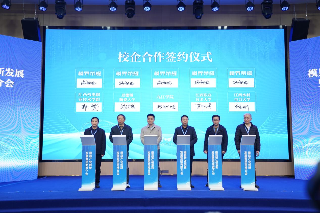 现场签约仪式由九江市政府副市长、经开区党工委书记陈水连主持。beat365官方网站、江西水利电力大学、景德镇陶瓷大学、江西职业技术大学、江西机电职业技术学院代表上台与模界荣耀科技有限公司签订了战略协议。