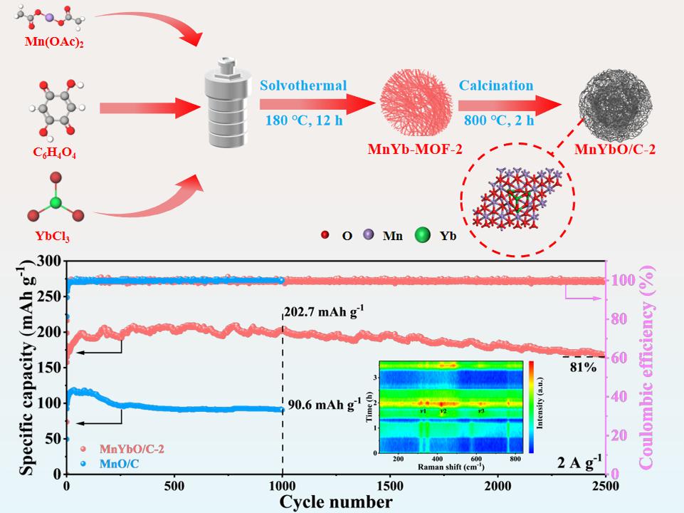 在《Chemical Engineering Journal》(中科院1区Top期刊,影响因子13.1995)上发表的题为“Suppressing Jahn-Teller Distortion and Accelerating Ion KineticsviaHeterostructure Engineering for Stable Aqueous Zinc-Ion Batteries”的研究论文中,团队创新引入稀土元素镱(Yb),通过MOF衍生法制备了Yb2O3-MnO/C异质结构纳米棒(MnYbO/C-2)。DFT计算证实,Yb₂O₃的引入可缓解Jahn-Teller畸变,降低H⁺与Zn²⁺的吸附能,强化结构稳定性。MnYbO/C-2在0.2 A g⁻¹下循环110圈后比容量达347.4 mAh g⁻¹,2 A g⁻¹下循环2500圈仍保持168.5 mAh g⁻¹的容量,其H⁺/Zn²⁺共嵌入机制通过原位拉曼与非原位表征得到证实。