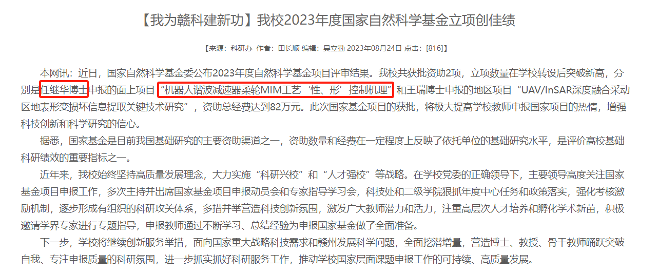 为进一步提高教育教学质量与科研创新能力,11月3日,“精密传动系统科研创新团队”建设启动会在工程研究院S416A会议室召开。国家自然科学基金委公布2023年度自然科学基金项目评审结果。bat365共获批资助2项,立项数量在学校转设后突破新高,分别是任继华博士申报的面上项目“机器人谐波减速器柔轮MIM工艺‘性、形’控制机理”和王瑞博士申报的地区项目“UAV/InSAR深度融合采动区地表形变损坏信息提取关键技术研究”,资助总经费达到82万元。此次国家基金项目的获批,将极大提高学校教师申报国家项目的热情,增强科技创新和科学研究的信心。