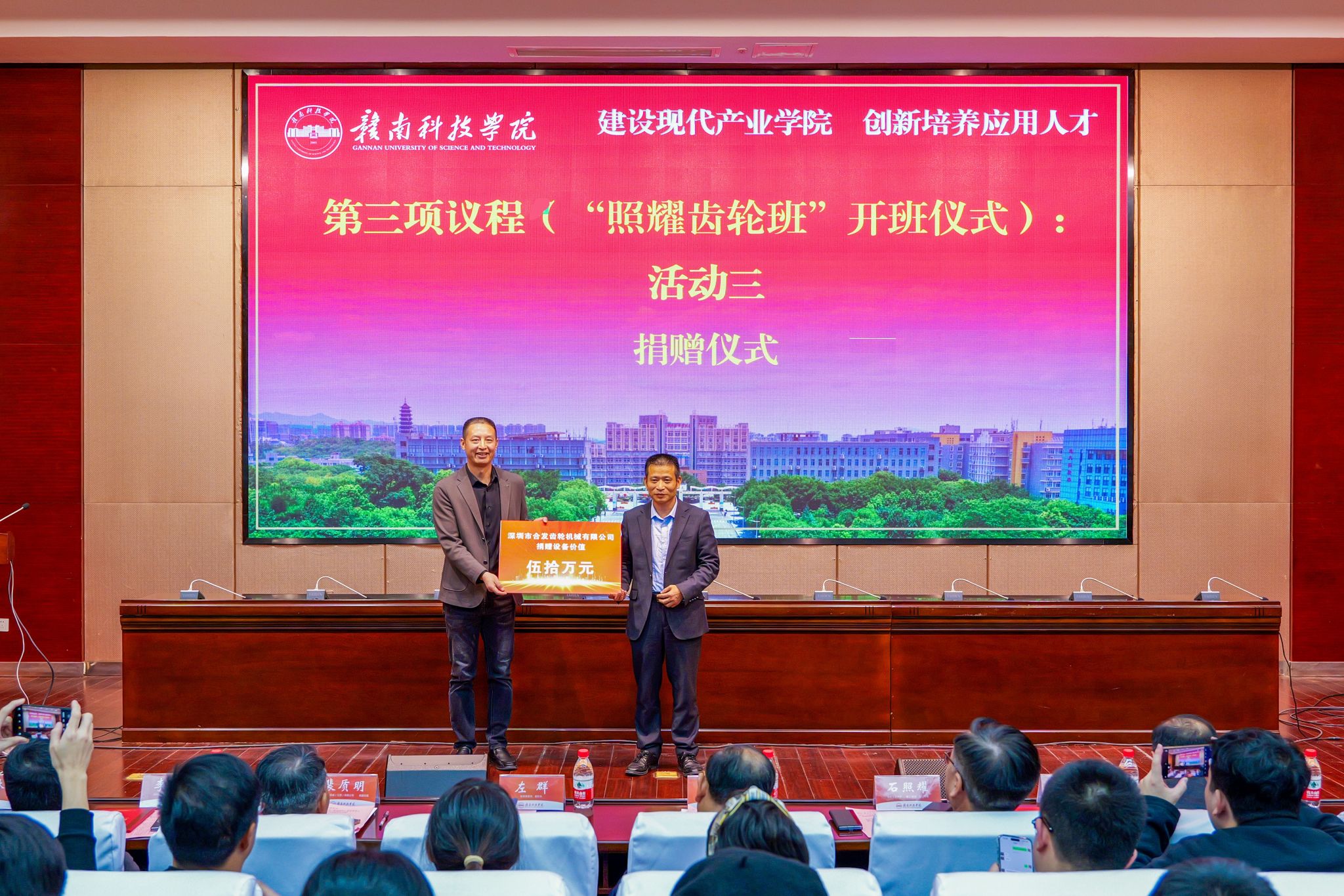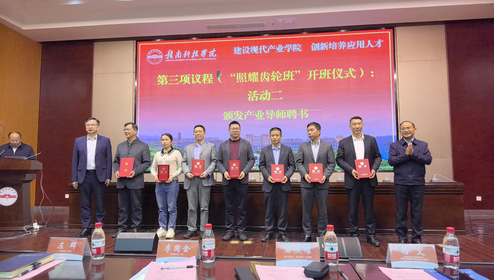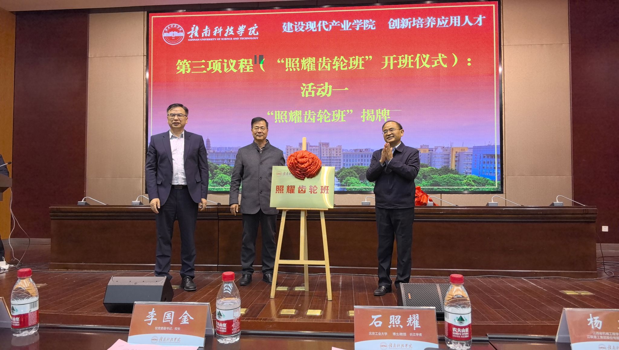 李国金、石照耀和杨文共同为“照耀齿轮班”揭牌,李国金与石照耀分别为裴质明、李海周、曹小林等企业代表颁发产业导师聘书、为杨文颁发省级产业教授证书。深圳合发齿轮有限公司捐赠了一批设备,助力“照耀齿轮班”人才培养。