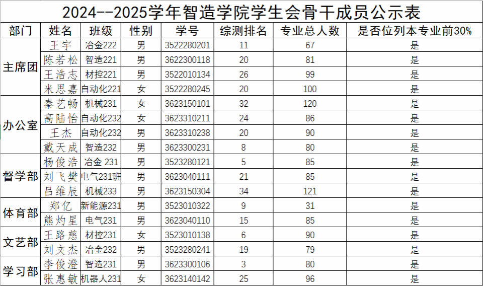 大会秉持着挑选学生会成员思想政治素质高、学习成绩优良,无课业不及格情况,且综 合成绩排名位列专业前 30%,下方是bat365官方网站学生会主席团及学生骨干的基本信息和成绩。