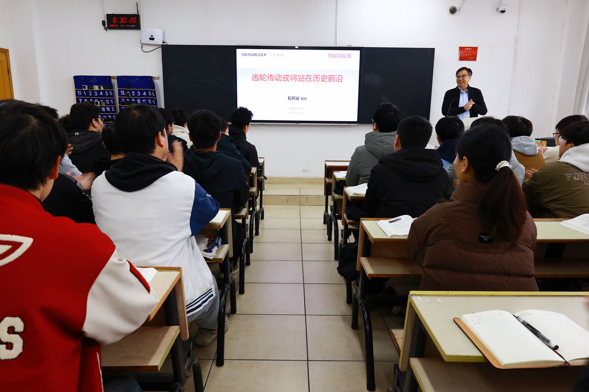 石照耀教授以“齿轮传动或将站在历史前沿”为主题,系统梳理了齿轮技术的历史演进、关键技术突破、智能制造应用及未来趋势,深入剖析了该领域的最新动态。他结合自身多年的科研实践和工程经验,通过生动的案例和详实的数据,向学生展示了齿轮技术在汽车电动化、人形机器人和新能源技术等领域的创新应用,并阐释了智能制造技术为齿轮行业的革命性推动作用。
