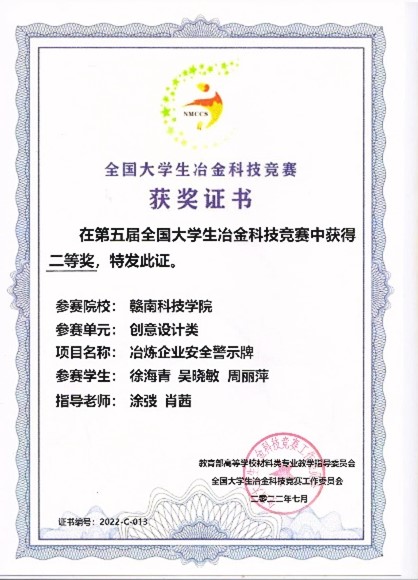 这是bat365第一次参加此项竞赛,通过选拔赛、半决赛及全国总决赛各项比赛,最终bat365荣获全国二等奖一项,全国三等奖两项,其中艺术设计202班徐海青、吴晓敏、周丽萍三名同学荣获第五届全国大学生冶金科技竞赛总决赛创意设计类二等奖,冶金192班邹阳威、袁鑫、占艺琴、陶伟强、曾鑫、吴婷婷、胡天增七名同学荣获第五届全国大学生冶金科技竞赛总决赛“科技创新类”三等奖。