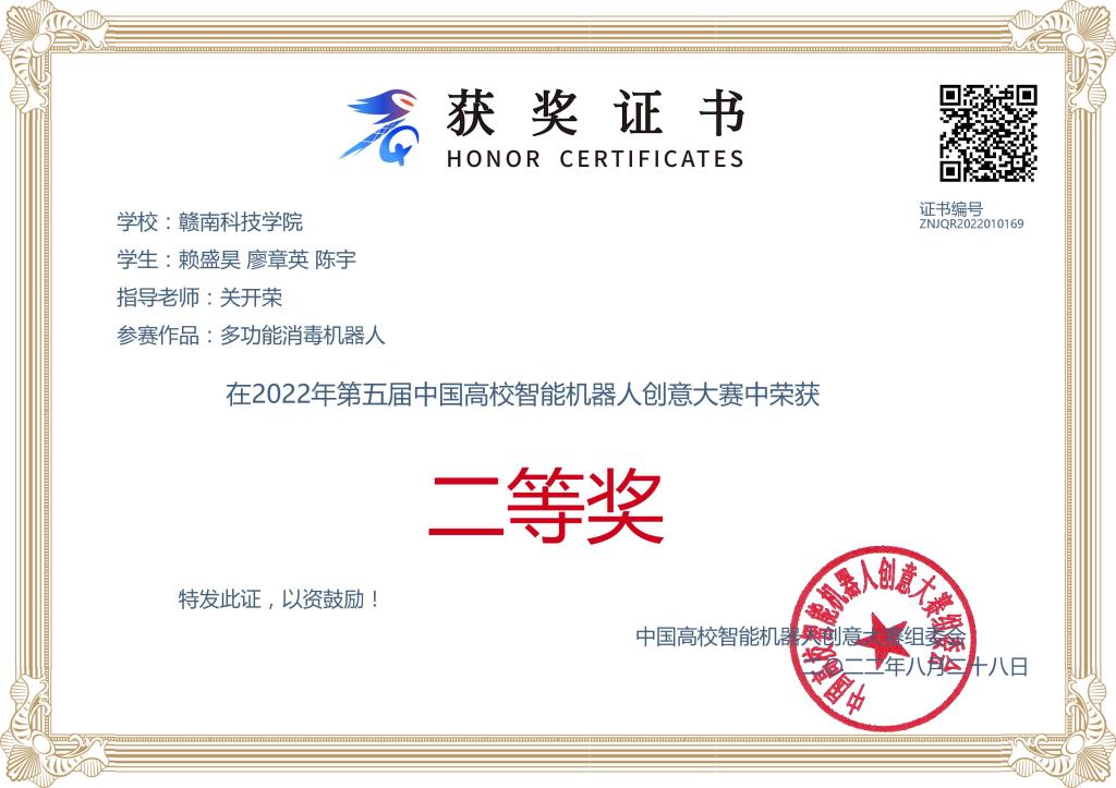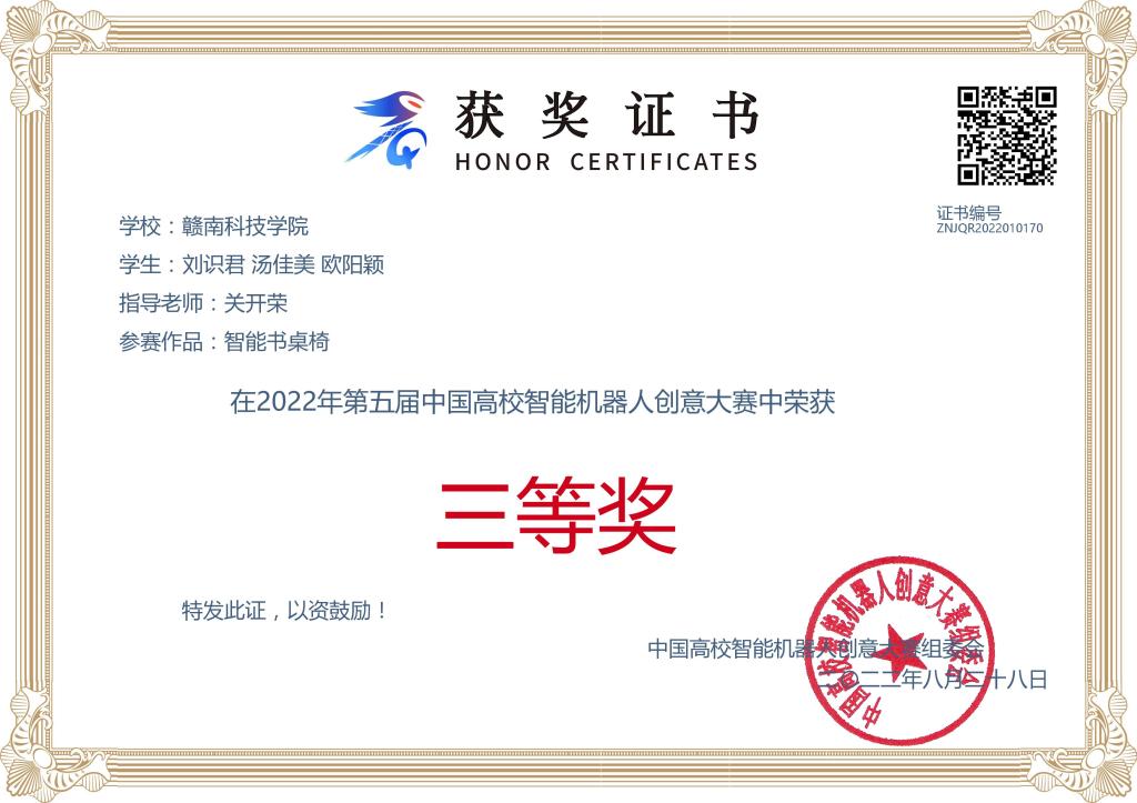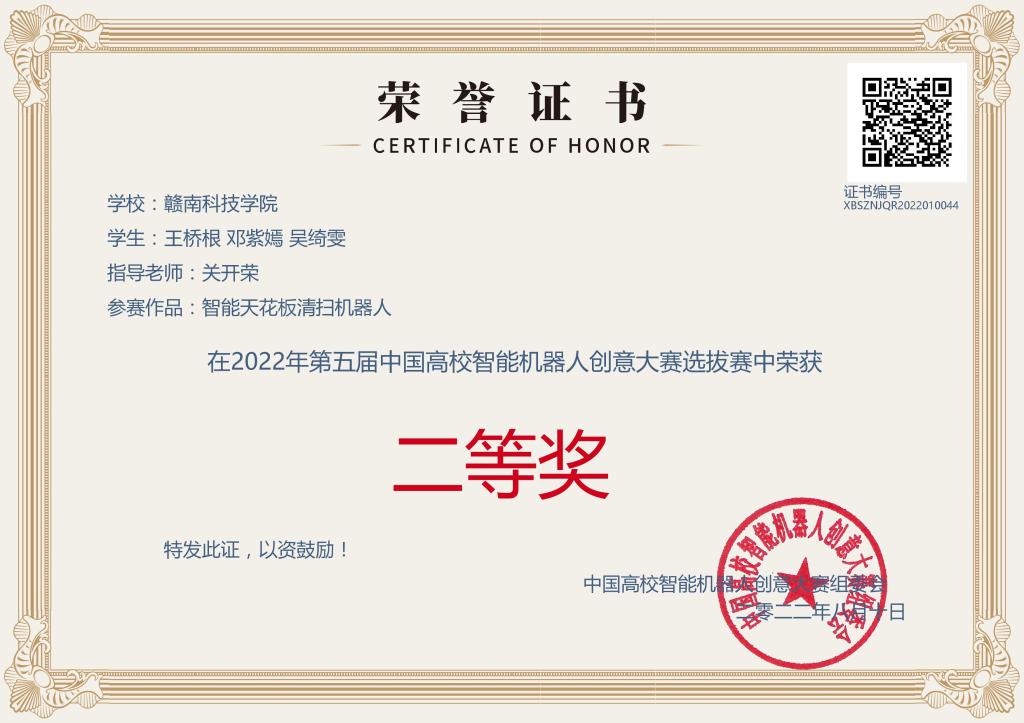 bat365参赛作品经过区域赛选拔和总决赛,最终,4支队伍在区域赛中获奖,2支队伍在全国决赛中获奖。其中,赖盛昊、廖章英、陈宇团队设计的作品“多功能消毒机器人”获得国家二等奖,刘识君、汤佳美、欧阳颖团队设计的作品“智能书桌椅”获得国家三等奖,王桥根、邓紫嫣、吴绮雯团队设计的作品“智能天花板清扫机器人”获得选拔赛二等奖,薛登博、郭家俊、曹周泉团队设计的作品“多功能智能桌”获得选拔赛三等奖。