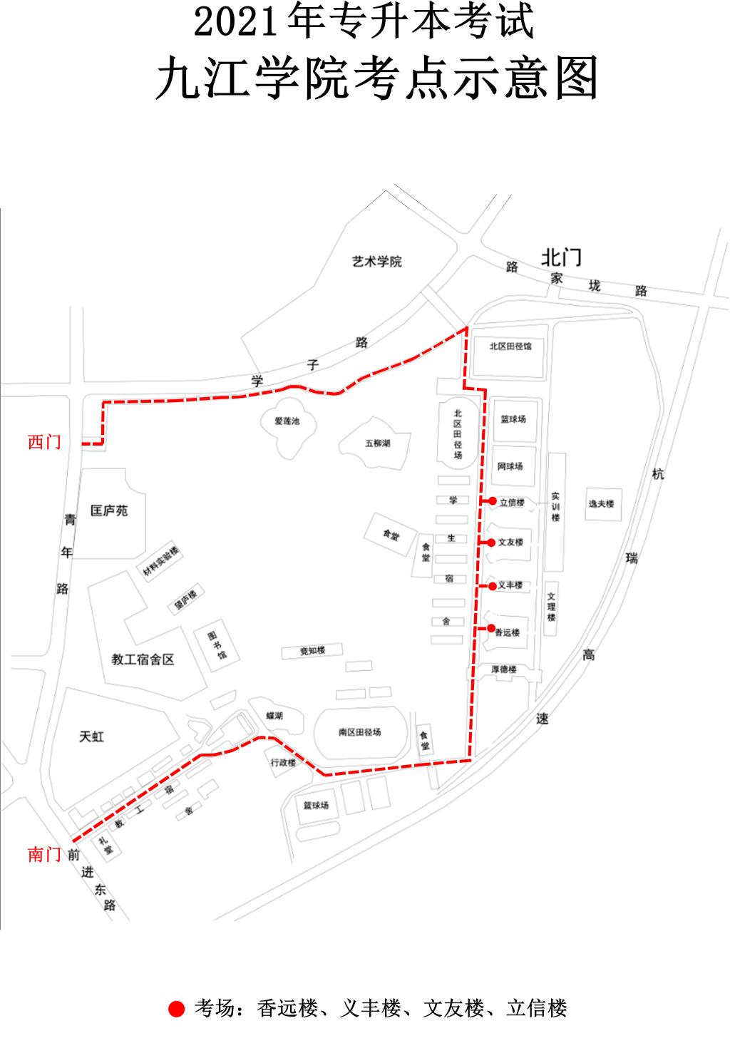 1.考生一律从南门或西门进入校园,同时,须主动出示赣通码绿码,并配合工作人员接受体温检测。除考生外,其他陪同人员及送考车辆一律不得入校。